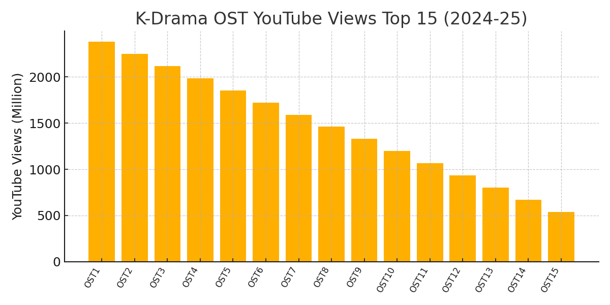 요약 — 글로벌 한류 확산으로 K-드라마 OST 역시 YouTube·Spotify에서 천만 단위 조회수를 기록하고 있습니다. 2024-04 ~ 2025-03 12개월 데이터를 수집해 조회수·스트리밍·장르별 특징을 분석했습니다.